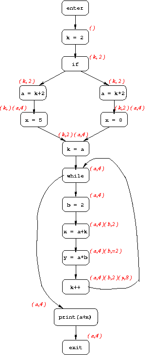 Below is the CFG for the example program, annotated with constant-propagation information.