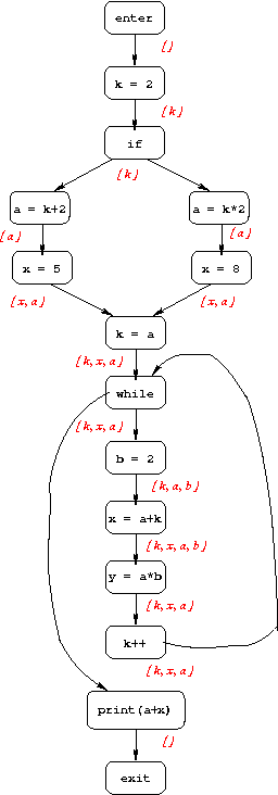 The goal of live-variable analysis is to determine which variables are "live" at each point in the program; a variable is live if its current value might be used before being overwritten. The information computed for each CFG node is the set of variables that are live immediately after that node. Below is the CFG for the example program, annotated with live variable information.